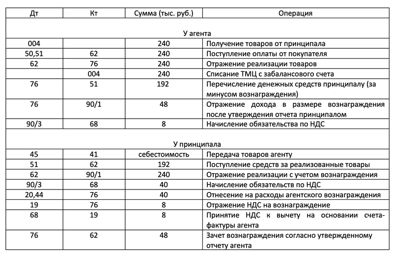 Формирование бухгалтерских проводок у сторон при передаче товаров по агентскому договору стоимостью 240 000 рублей с дальнейшей реализацией и удержанием вознаграждения агентом при участии в расчетах в размере 20% представлено в таблице: