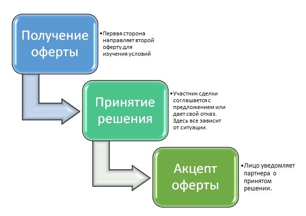 Изначально стороны обсуждают положения соглашения. Во время процедуры происходит определение условий сотрудничества. После этого одна из сторон направляет оферту, а вторая соглашается с ней.