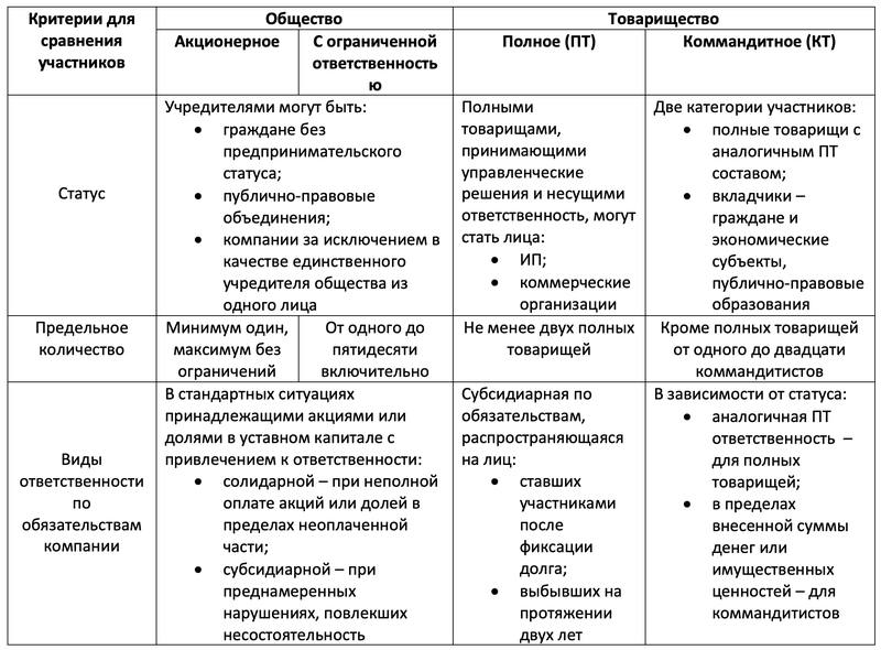 Различия правовых форм коммерческих организаций влияют на значимые управленческие параметры. Отличия хозяйственных обществ от товариществ полных и на вере представлены в таблице: