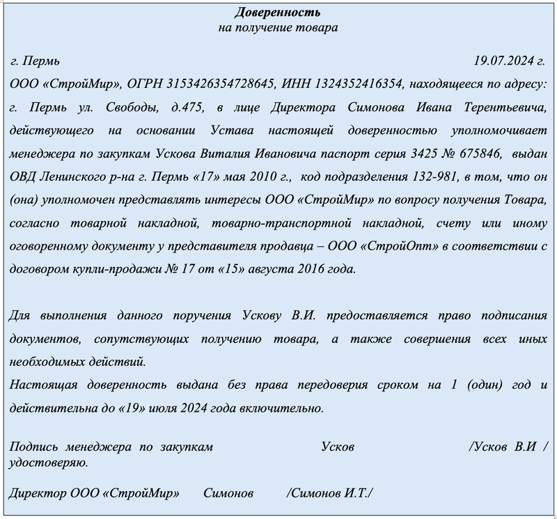 При заключении договора поставки материалов, продукции или купли-продажи не прописывается конкретное лицо, которое вправе получить товар. По умолчанию таким правом наделяется только руководитель, который подписывал соглашение. Временно передать полномочия можно с использованием доверенности на ТМЦ. При отсутствии документа поставщик вправе отказать в выдаче товара.
