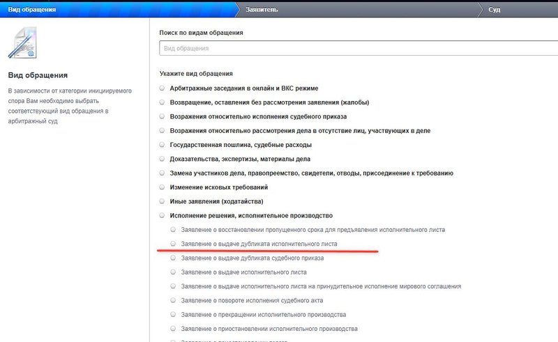 - в категории «Исполнение решения, исполнительное производство» найти пункт «Заявление о выдаче дубликата исполнительного листа»;