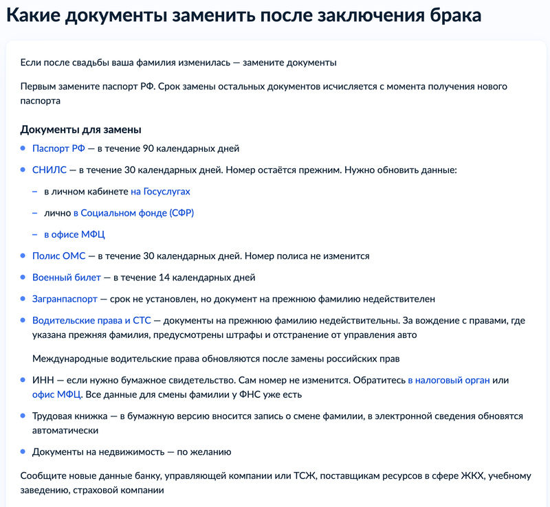 - Смена паспорта при смене фамилии после замужества