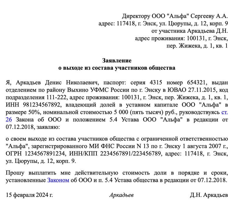 Этап 1: Составление заявления, на основании которого выполняется выход из состава участников