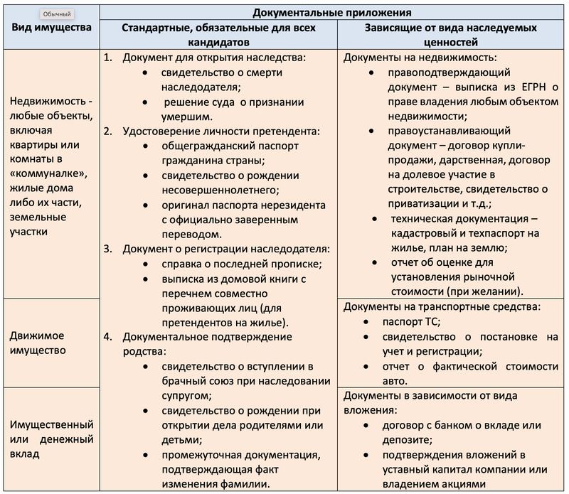 Для наследования необходимо посетить нотариуса, которому изложить в заявительном порядке намерение. К заявлению необходимо приложить комплект документов в зависимости от статуса наследника и наследуемого имущества, указанных в таблице:
