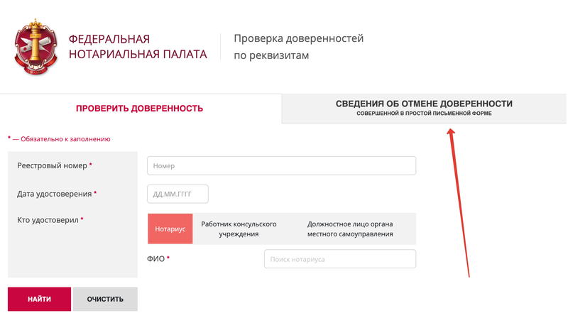 Если доверенность была отменена, то информация также будет отображена в реестре нотариальных доверенностей.
