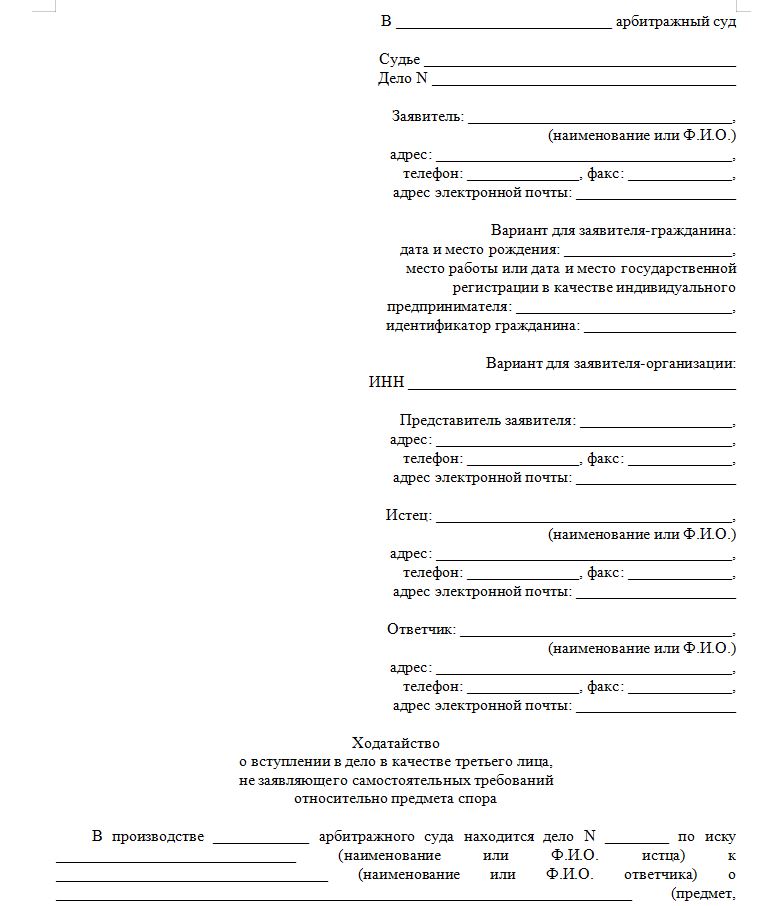 Бланк ходатайства о вступлении в дело в качестве третьего лица, не заявляющего самостоятельные требования