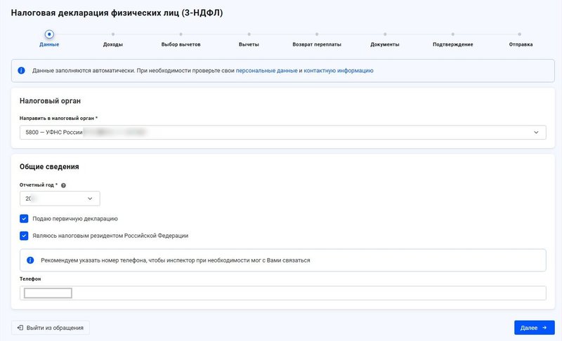 Большая часть сведений сформируется путем автозаполнения. Проверьте, правильно ли указана налоговая, год сдачи отчета 3-НДФЛ, в первый раз подается декларация или нет, а также относитесь ли вы к категории налоговых резидентов РФ. Впишите номер телефона, если он не указан.