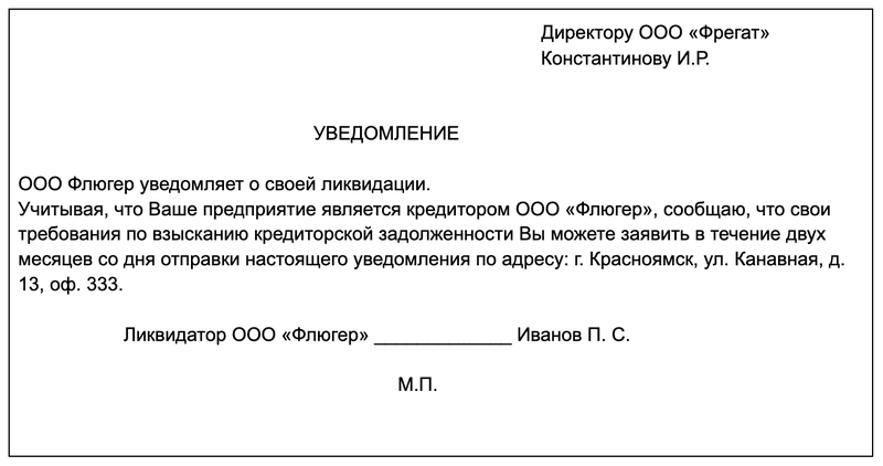 Образец уведомления кредиторов о ликвидации юридического лица