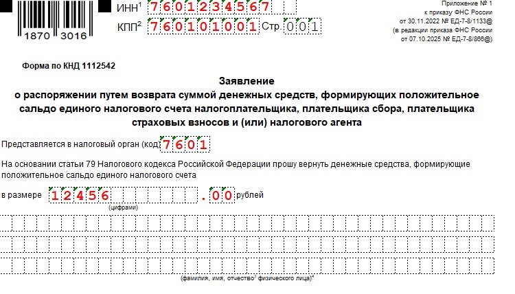 С 15 января 2026 года вступили в силу изменения в Приказ ФНС от 30.11.2022 № ЕД-7-8/1133@. Для распоряжения положительным сальдо единого налогового счета (ЕНС) после указанной даты используйте обновленные бланки заявлений.