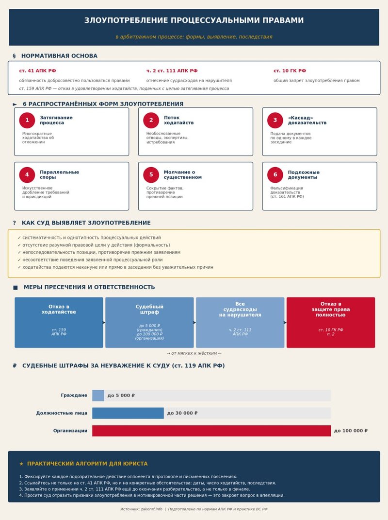 | Затягивание процесса | Повторные ходатайства об отложении без подтверждающих документов; немотивированные отводы | Ст. 159 АПК РФ — отказ в удовлетворении; ч. 2 ст. 111 АПК РФ — отнесение судрасходов |